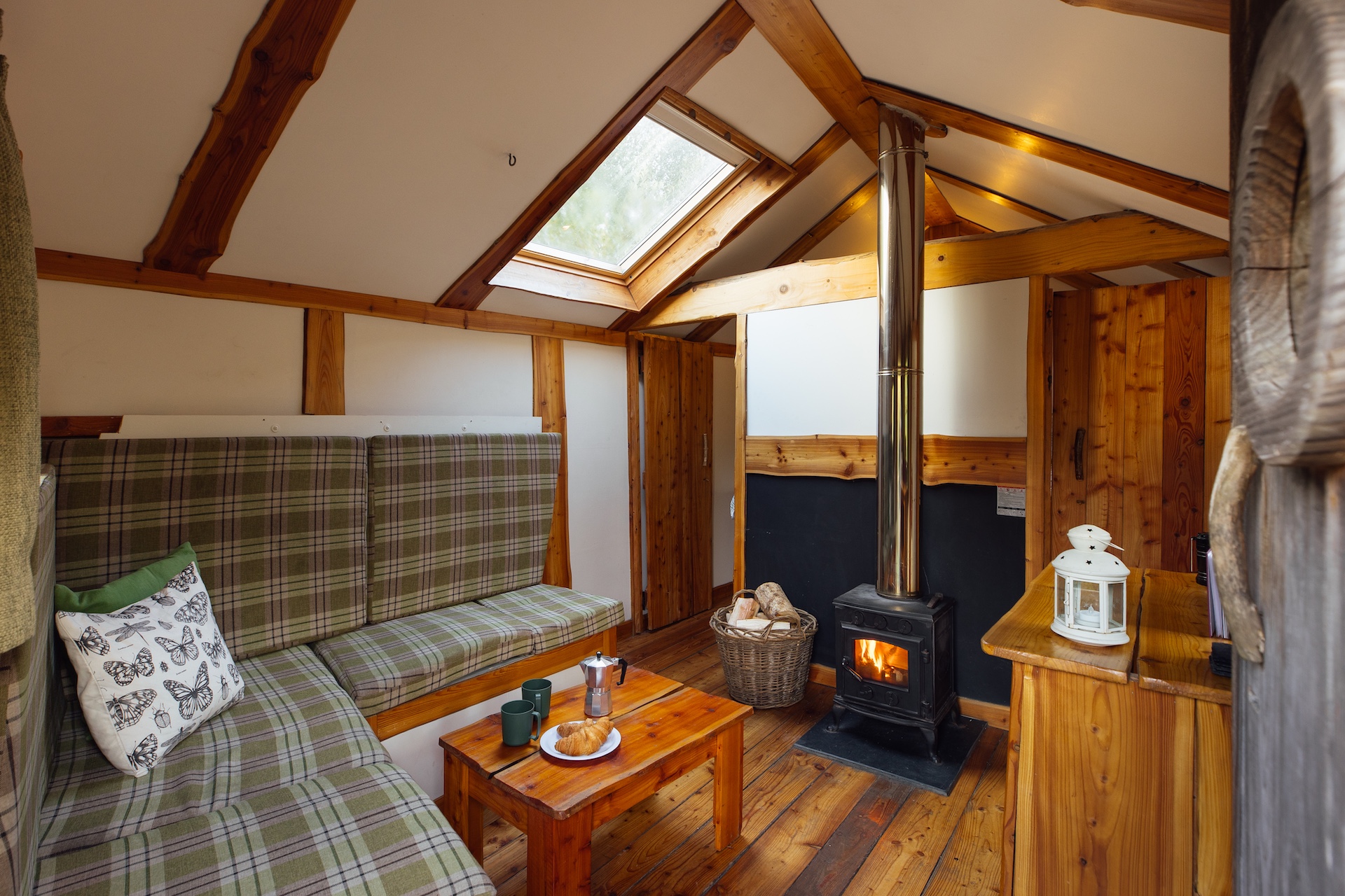 Internally, Pyatt's Nest also has a table and chairs, communal seating area and even a log burner for cosy nights (we supply your wood too).